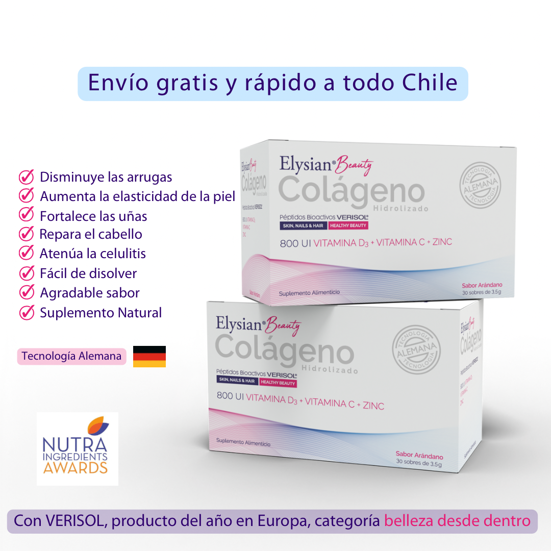 Elysian®Beauty, está formulado con Péptidos Bioactivos de Colágeno VERISOL®🇩🇪, Vitamina D, Vitamina C y Zinc.